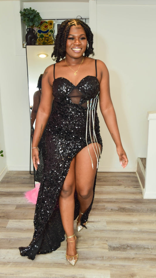 BLACK SEQUINS MAXI DRESS WITH SIDE SPLIT